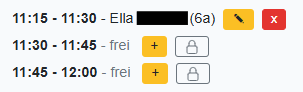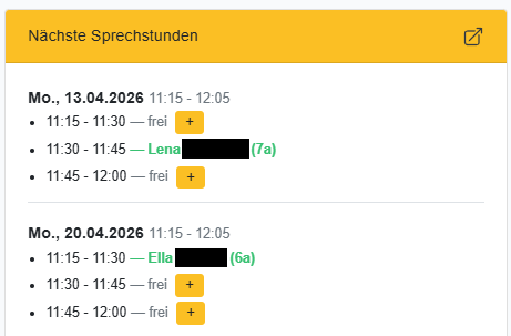 + Jede Sprechstunde wird standardmäßig in 3 Slots zu je 15 min unterteilt (Anzahl und Zeit konfigurierbar sowohl schulweit als auch individuell)